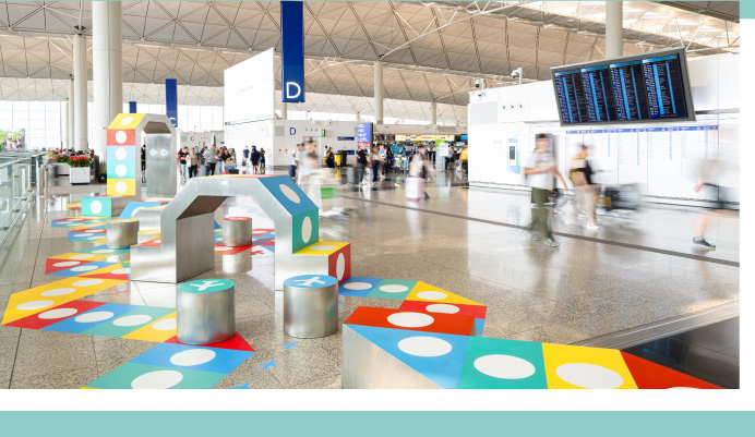In the Departures Hall, a section of public seating is transformed into an engaging art installation that not only continues to provide seats but also invites visitors to immerse in the setting inspired by the “Aeroplane Chess” that has been popular across different generations of Hong Kong residents.