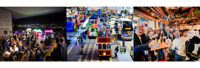 亞博館特別將年會晚宴移師至 M+舉行,使商務議程延伸至當代藝術空間。除了美酒佳餚,晚宴以霓虹燈、本地小食及文化攤位等,將場地打造成「香港城市街景」,讓與會者更深入感受地道特色的大都會氛圍。亞博館更積極推動商務休閒旅遊(Bleisure) 趨勢,鼓勵與會者延長逗留、深度探索香港。「電車夜遊派對」帶與會者乘開篷「叮叮」穿梭繁華商業區;其後到訪蘭桂坊,讓商務交流隨城市脈搏延展,輕鬆節奏中認識香港的多面魅力。