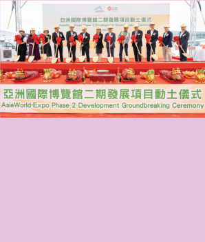亞洲國際博覽館第二期發展項目於8月11日舉行動土儀式,機管局行政總裁張李佳蕙、機管局和亞博館,以及承包商協興工程有限公司高級管理人員,聯同運輸及物流局常任秘書長蔡傑銘等多位政府官員一同出席典禮。