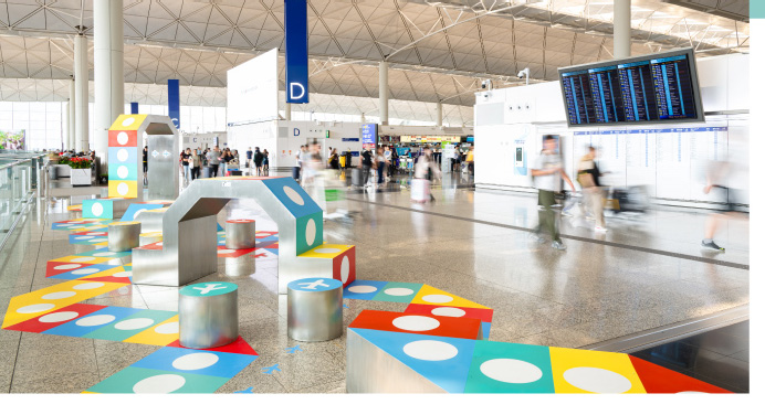 離港大堂的部分公眾座椅亦轉化為創意與功能並重的藝術裝置,設計靈感源自跨世代長青遊戲─「飛行棋」,讓公眾樂坐「棋」中之餘,亦能細味本地藝術家的匠心傑作。